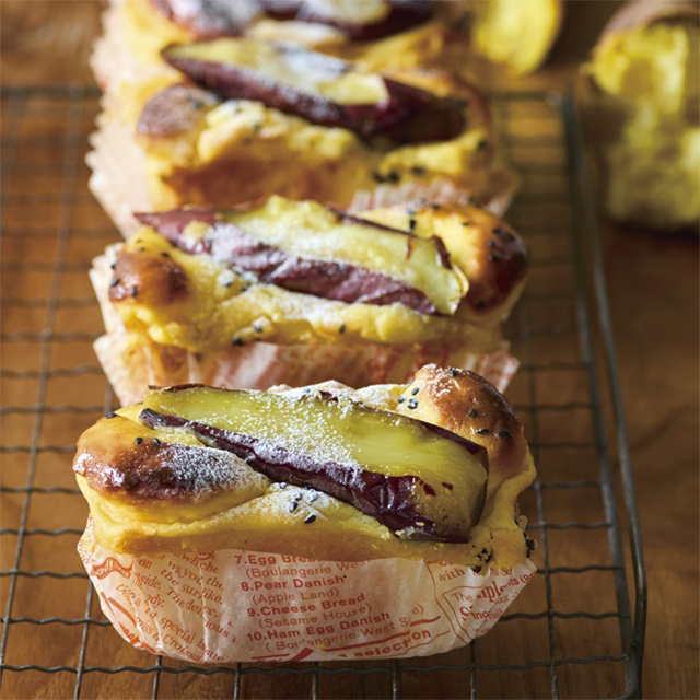 さつまいものペーストとチーズクリームを生地に巻き込み、紅はるかの焼き芋をトッピング。