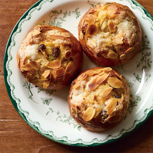 ラムレーズンを練り込んだ生地に、バターとシュガーをのせて焼き上げました。