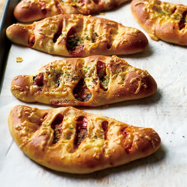 グリル野菜(ズッキーニ、赤ピーマン、黄ピーマン、ナス)とソフトサラミ、ピザソース、チーズを包み焼き上げました。