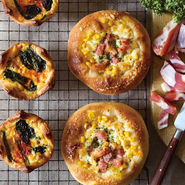 たっぷりのとうもろこしとベーコン、ほうれん草を合わせたキッシュ。