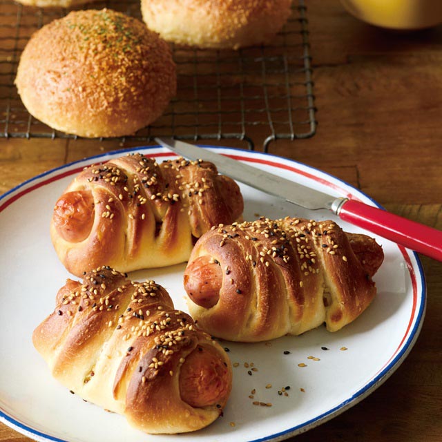ボリュームのあるポークソーセージにザワークラウトと粒マスタードを合わせた食事系パン。