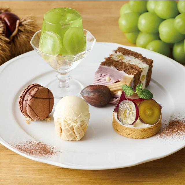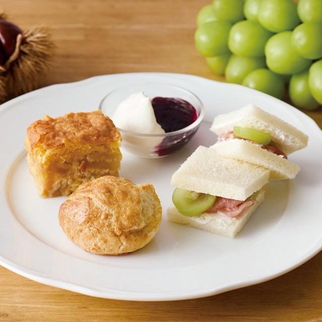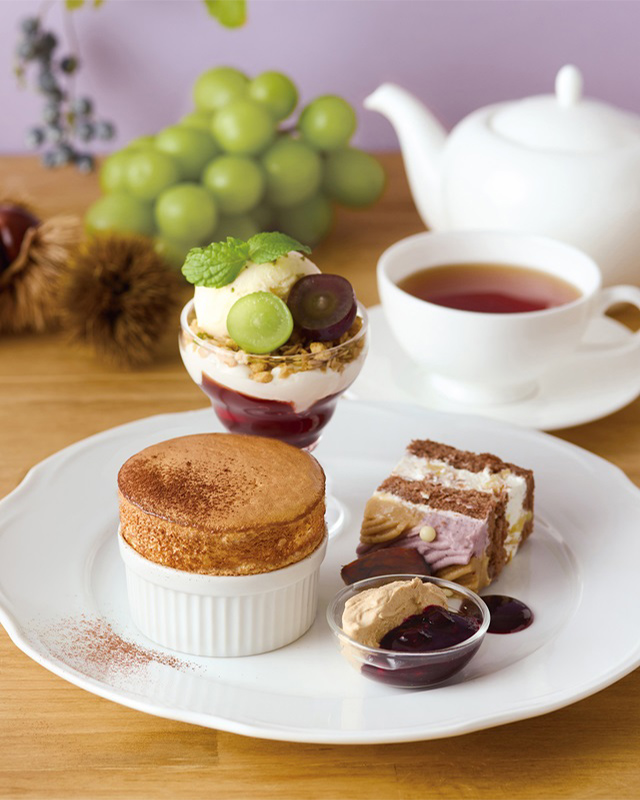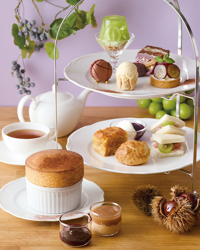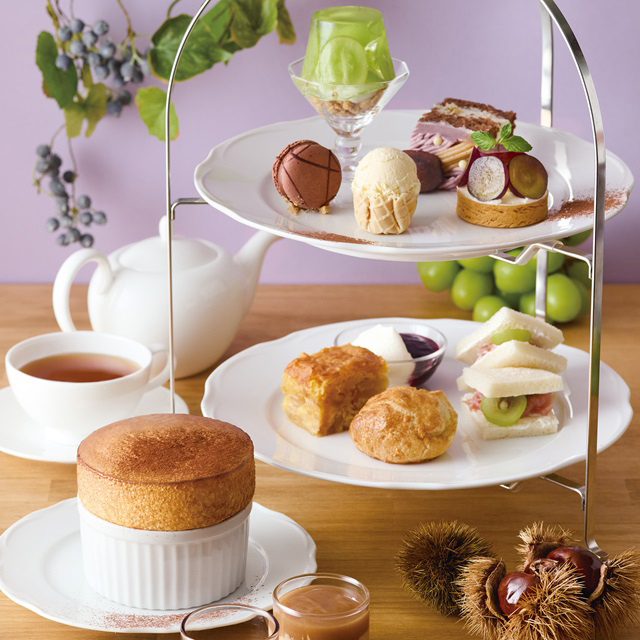 焦がしバターの香る焼き立てのスフレと、シャインマスカット、巨峰、栗を使用した4品を含むスイーツ7品、セイボリー1品をティーフリーでお楽しみいただける贅沢なアフタヌーンティーセット。