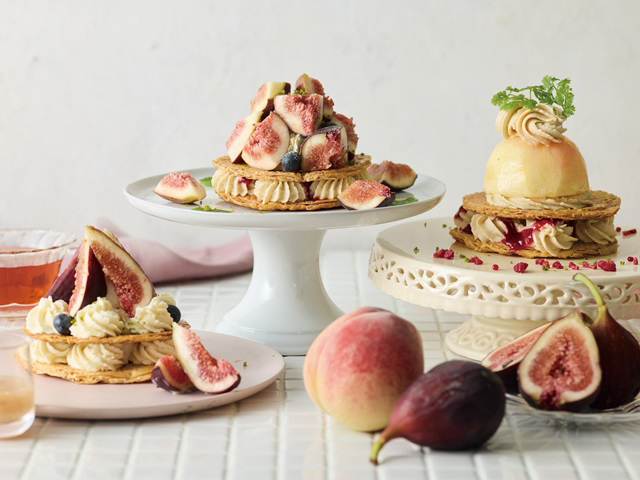 ティールームのルミネ有楽町、東京スカイツリータウン・ソラマチ、紙屋町シャレオでは、2025/7/17から、まるごと白桃をのせたミルフィーユ、2025/8/14からは、上品な甘さのいちじくにフローズンヨーグルトをあわせたフルーツミルフィーユ2種が順次登場します。