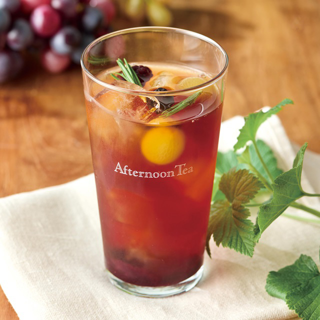 グレープルイボスに、巨峰、ティーゼリー、葡萄とブラックベリーのソースを合わせたフルーツエードティー。