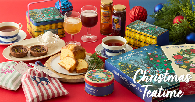 クリスマスのティータイムを楽しむお茶やお菓子が、イラストレーター サクマユウコさんによる限定イラストパッケージで勢揃いしています。