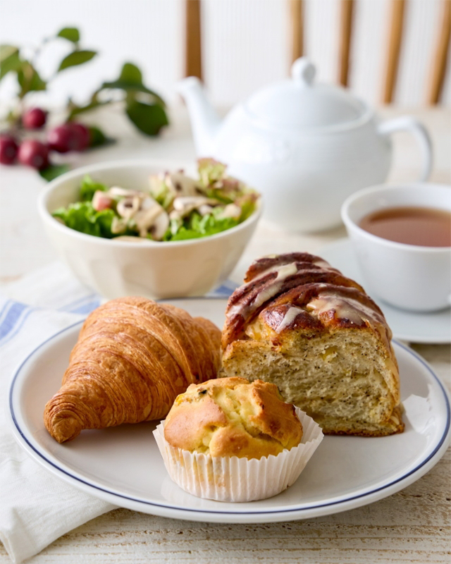 その日の朝に焼き上げた数種類のパンからお好きな3個と、サラダまたはスープを、ティーフリーでお楽しみいただけます。ベイカリーならではのお店で焼き上げたパンの美味しさとたっぷりの紅茶で、ブランチタイムの贅沢なひとときをご堪能ください。