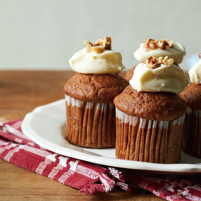たっぷりの人参とココナッツ、ラムレーズンにスパイス(シナモン・クローブ)を合わせ、ふんわりと焼き上げました。クリームチーズフロスティングをのせて。