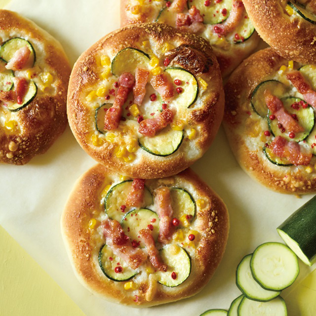 ホップス生地に、コーンマヨを敷き詰めてパンチェッタ、ズッキーニをのせて焼き上げました。