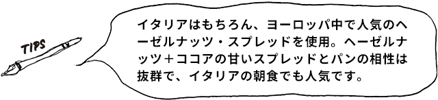ココア生地に渋皮入りマロンクリームを巻き込んで、イタリアで人気のヘーゼルナッツ・スプレッドをトッピング。ヘーゼルナッツとマロンの相性が楽しめます。