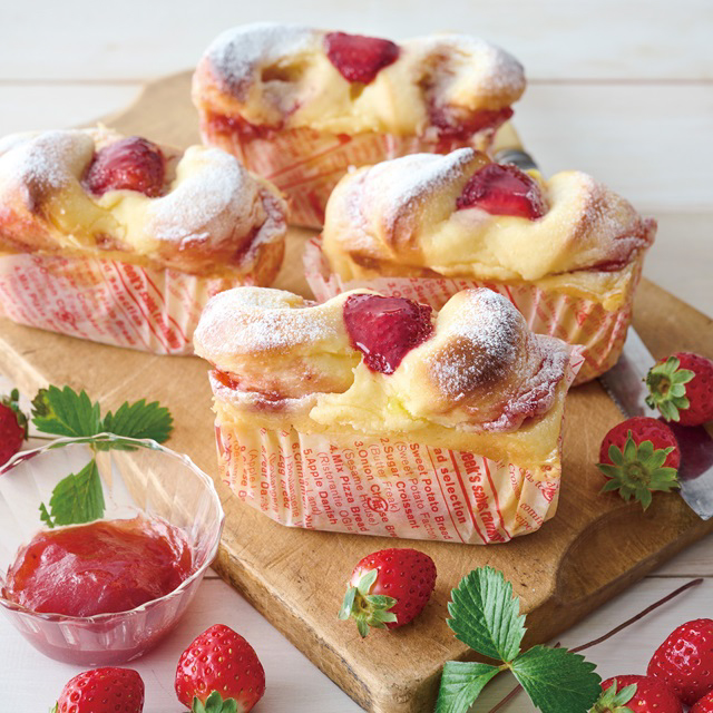 ストロベリージャムとチーズクリームを生地に巻き込んで焼き上げました。
