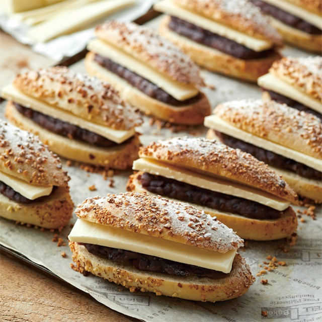 十勝産の小豆を使った粒あんと、「カルピス(株)バター」をサンドしました。トッピングのアーモンドとあんバターの相性をお楽しみください。