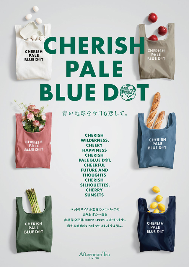 「CHERISH PALE BLUE DOT」プロジェクトの始動を記念して発売したペットリサイクル素材を使用したエコバッグ1枚お買い上げにつき5円を森林保全団体「more trees」に寄付。