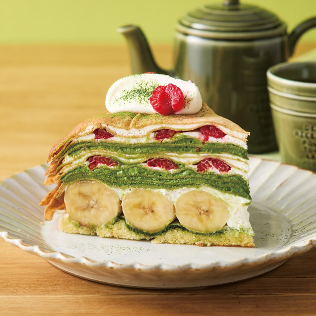 濃厚な抹茶クリームとマスカルポーネホイップ、バナナを重ねました。甘酸っぱいフレッシュラズベリーがアクセント。