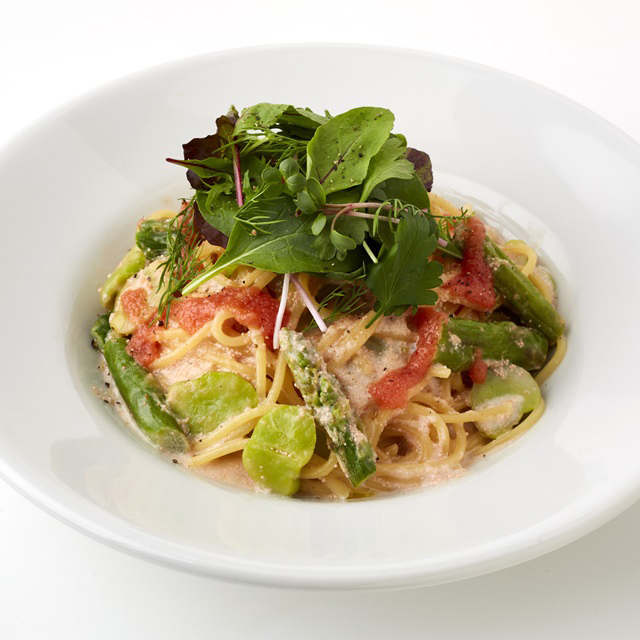 バター香る明太子のソースに、そら豆、アスパラガスを合わせました。ディルやイタリアンパセリなどのハーブサラダをトッピング。