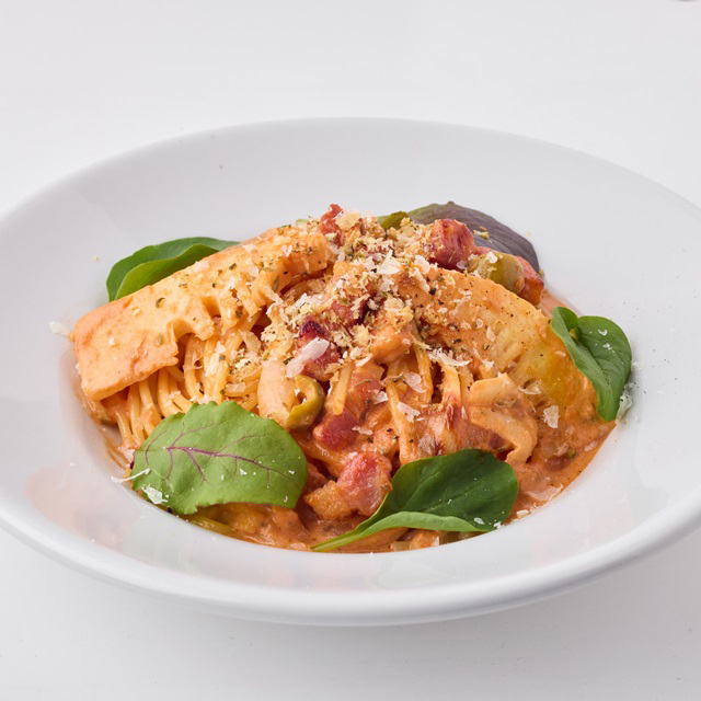オーブンでローストし甘みを引き出した淡路島産新玉ねぎと筍、パンチェッタ、オリーブをトマトクリームソースで合わせました。