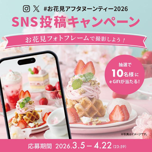 さらに、店内メニューの写真を撮って、InstagramまたはXにて投稿いただいた方の中から抽選で、ティールームでご利用いただけるAfternoon Tea TEAROOM e Gift ¥1,000分が10名様に当たるSNSキャンペーンも実施します。さらに「お花見フォトフレーム」を使って投稿すると当選率UP!