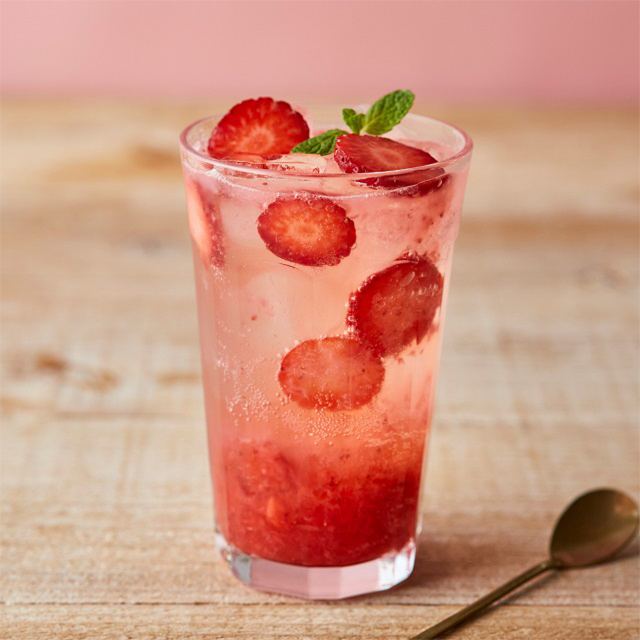 自家製いちごさんシロップに、しゅわしゅわソーダを合わせてフレッシュいちごさんをトッピング。