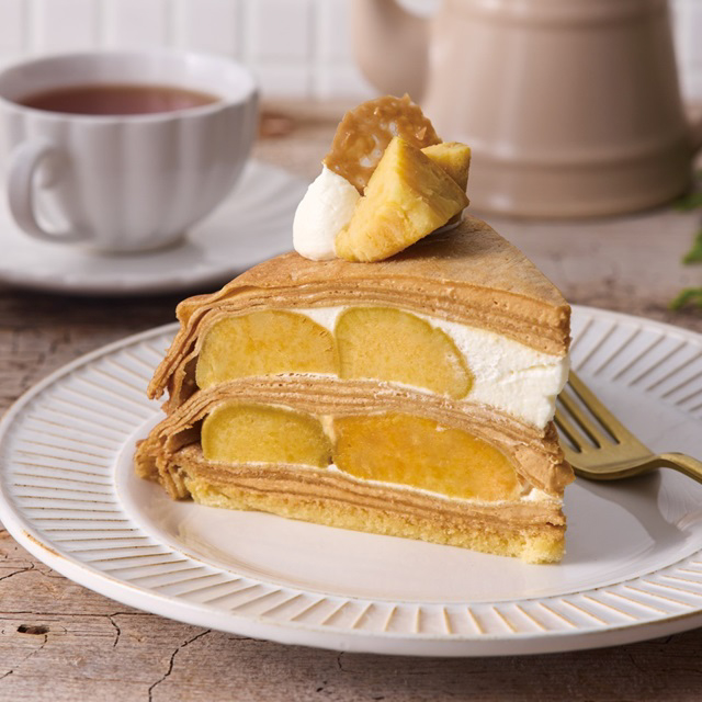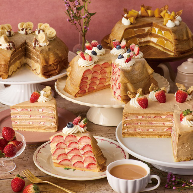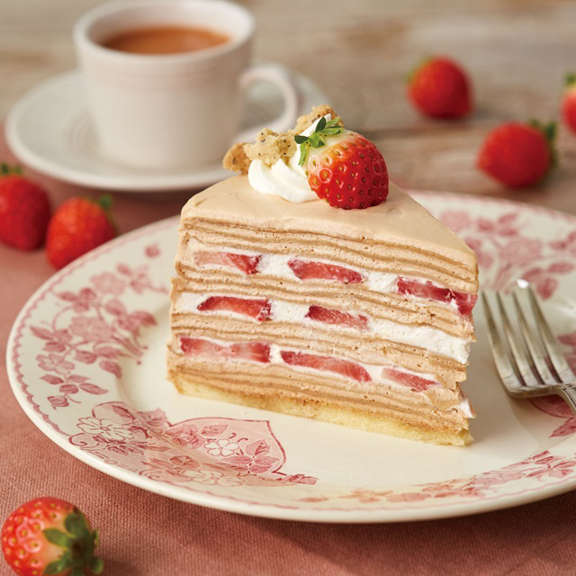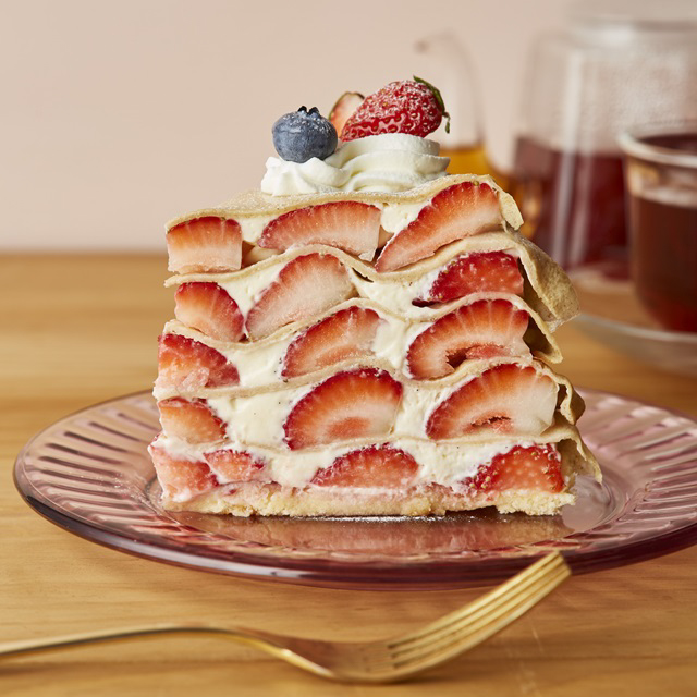 旬の苺をふんだんに使用し、ディプロマットクリームともちもち食感のクレープで5層に重ねました。