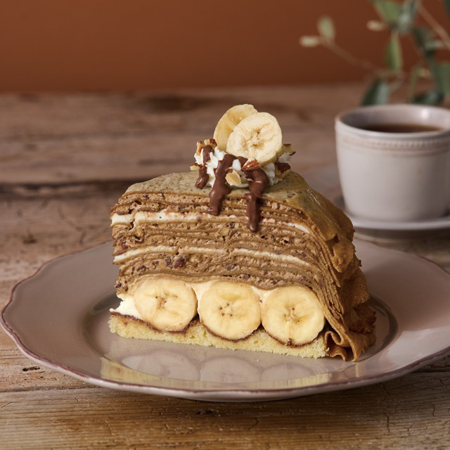 自家製のクレープ生地にコーヒー香るアーモンドモカクリームとバナナ、ラム酒を加えたカスタードクリームを重ねました。チョコチップとアーモンドのザクザク食感もお楽しみいただけます。