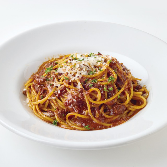 赤ワインと発酵バターを加えたコクのあるミートソースに、イタリア産ペコリーノチーズをたっぷりと削りました。