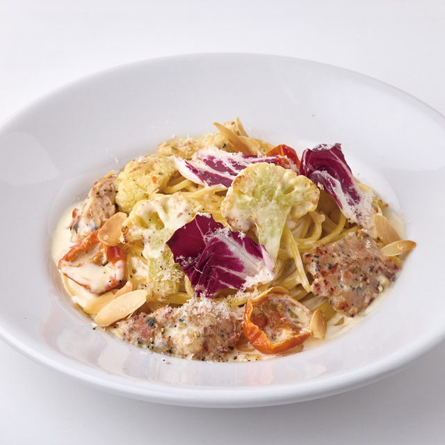 旬のカリフラワーとサルシッチャ、ドライトマトにクリームソースを合わせ、ローストアーモンドをトッピング。こんがり焼いたカリフラワーの優しい甘みをお楽しみください。