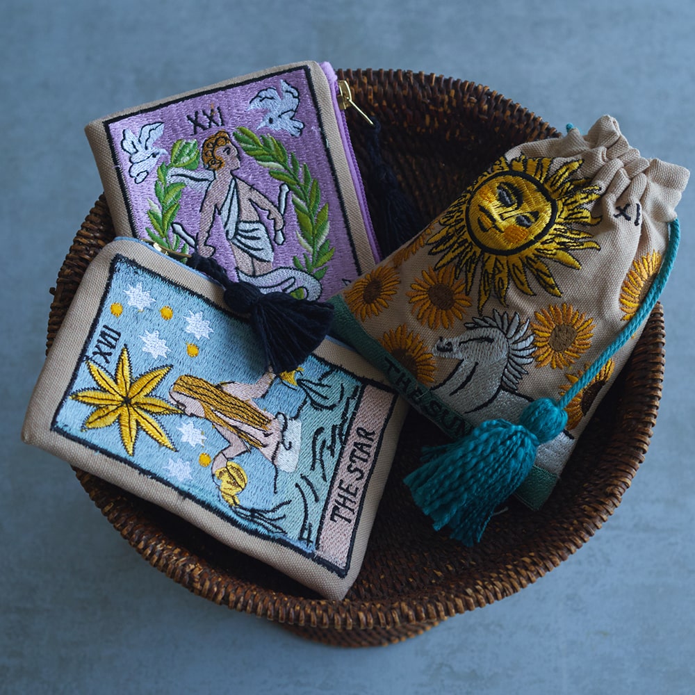 タロットカードのモチーフを贅沢に総刺繍であしらったポーチ。