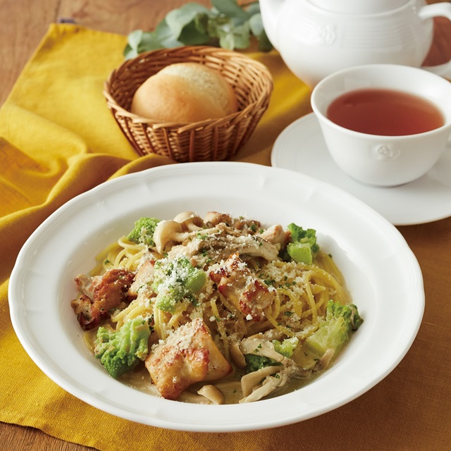 ポルチーニや、たまり醤油などを使用したコクのあるクリームソースに、ローストチキンと舞茸、しめじ、ロマネスコを合わせました。