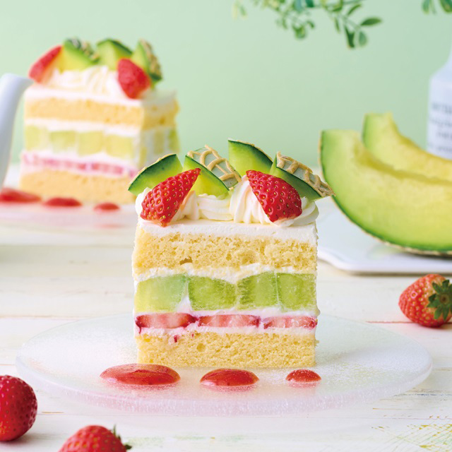 ジューシーなメロンの果肉と爽やかな酸味のいちごにしっとりきめ細かいスポンジと北海道産のフレッシュクリームを合わせました。どこを食べてもフレッシュなフルーツが味わえる贅沢なショートケーキ。