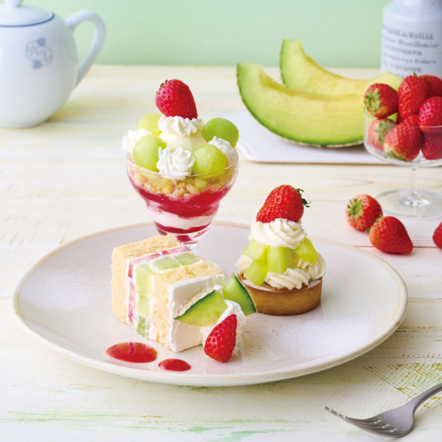 ティールームのテラスモール湘南、ららぽーと横浜、イオンレイクタウンkaze、名古屋ラシックでは、初夏を代表するフルーツ、爽やかな甘みとジューシーな果肉のメロンを楽しむスイーツが2026/4/23からお楽しみいただけます。