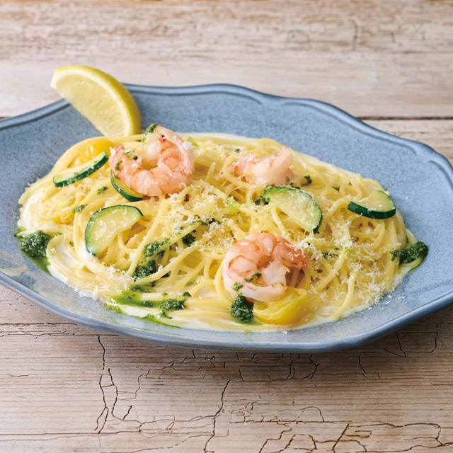 - 海老とズッキーニのレモンクリームソースパスタ