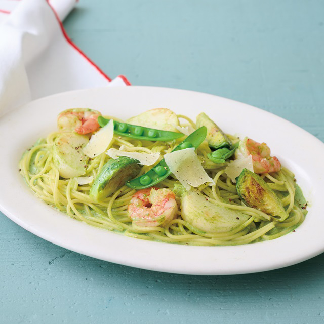 海老や芽キャベツ、かぶ、スナップエンドウに、ほうれん草のクリームソースを合わせた具沢山なパスタ。