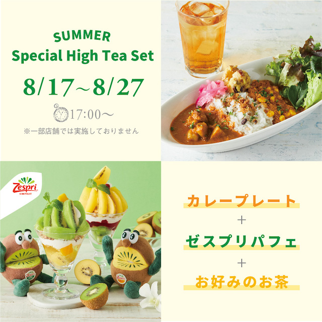 8/17~8/27の期間中、各日17時から「トマトチキン&とうもろこしキーマのカレープレート」と人気のゼスプリ・キウイパフェがお楽しみいただける特別なセットが登場!ゼスプリ・キウイパフェは2種のうちどちらかお好きな方をお選びいただけます。この時期だけのゼスプリ・キウイパフェを夜の時間にゆっくりお食事後のスイーツとして味わってみませんか。