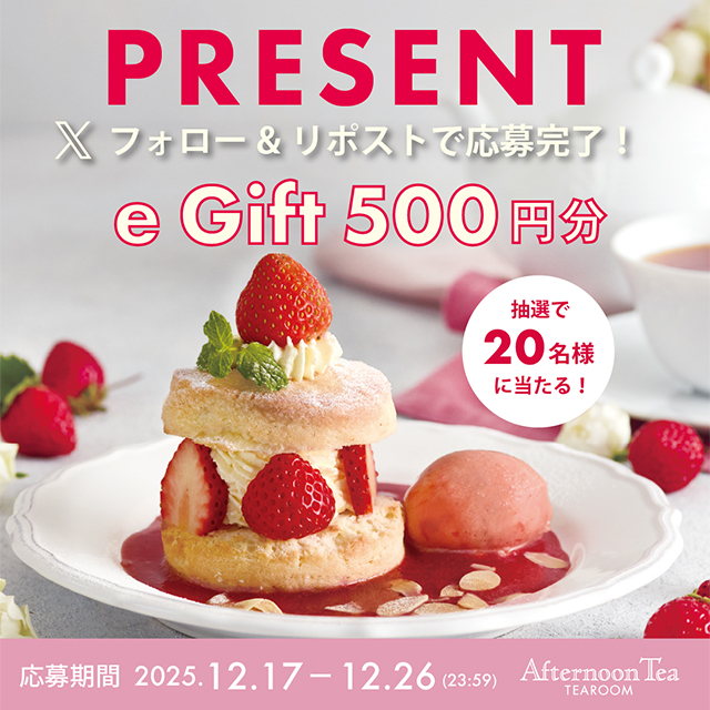 XのAfternoon Tea公式アカウント(@AfternoonTea_LT)にて「Afternoon Tea TEAROOM e Gift ¥500分」が抽選で20名様に当たる、フォロー&リポストキャンペーンを開催!