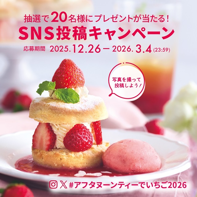 2025/12/26~2026/3/4の期間中、ティールームで展開する対象メニューの写真を撮ってInstagramまたはXに投稿すると、産地直送の紅白苺ギフトやAfternoon Tea TEAROOM e Giftが、抽選で20名様に当たるSNSキャンペーンを実施します。