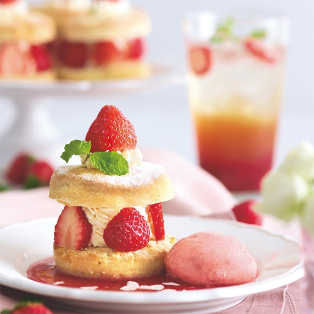 ¥1,890(紅茶付き)バニラビーンズ入りのさっくりふわっと食感のスコーンにフレッシュ苺、レモンミルクホイップをサンドしました。ストロベリージェラート、甘酸っぱい苺のソースとともに。