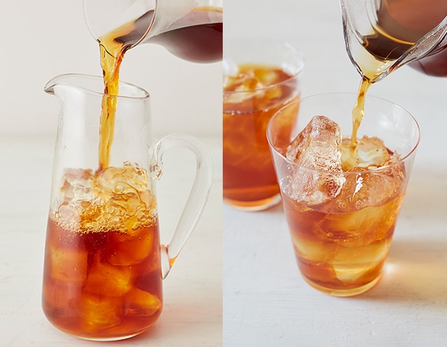 茶葉10gと熱湯350mlをポットに入れ、フタをして約2分半蒸らし、濃いめの紅茶をつくる。山盛りの氷(紅茶と同量の約350g)を入れたピッチャーに、熱々の紅茶を茶こしで茶葉を濾しながら注いで急冷する。クリームダウンしないように蒸らし時間を短めにしてもOK!