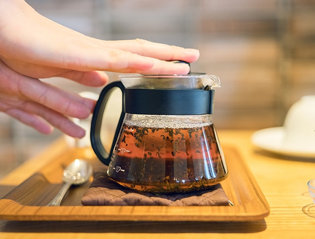 茶葉を蒸らすガラスのポットとティーポットを2つ用意して、ガラスのポットをよく温めた後、そのお湯をティーポットに移してティーポットを温めておきます。温まったガラスのポットに茶葉を入れ、沸かしたての熱湯を注ぎふたをして、3分蒸らします。