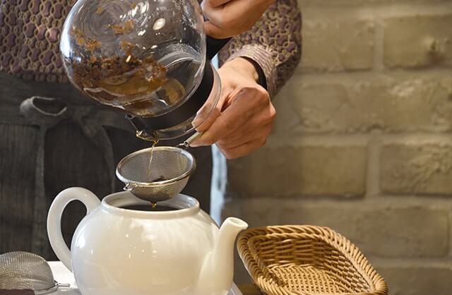 大きなガラスのポットで、たっぷり紅茶を淹れていきます。蒸らし時間を少し短めにするのがコツとなります。