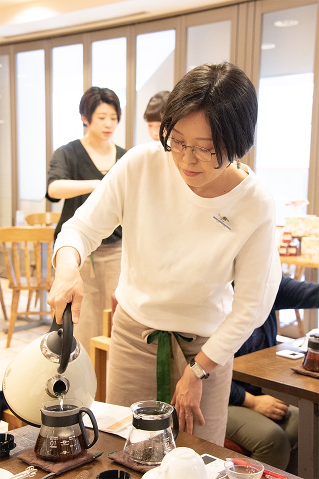 いよいよお客様の実践がスタート。茶葉を蒸らすガラスのポットを、熱湯で温めます。熱湯が入るポットの上部まで、手首を返すようにして温めたらボウルに熱湯を空け、5gの茶葉を入れます。スタッフが熱湯を350ml注いで回り、注がれたらふたをして、タイマーを押して3分待ちます。