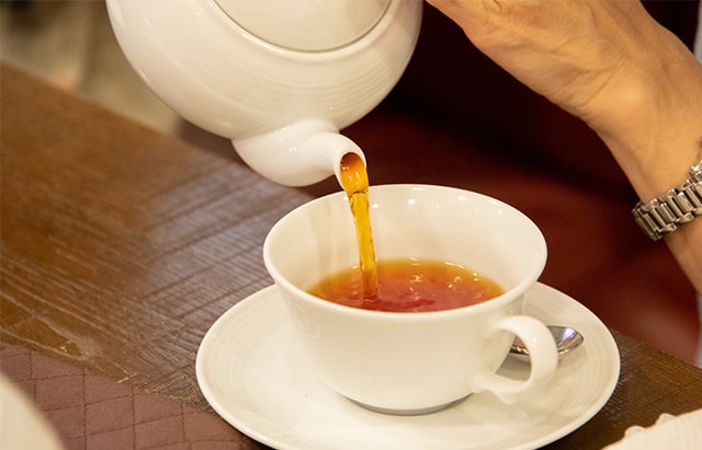 さあ、美しい色の、美味しそうな紅茶の出来上がりです!ティーカップに八分目まで注ぎます。口に当たる面がチューリップ型に開いたティーカップは、淹れたての紅茶を口に運びやすいだけでなく、ふんわりと香りも一緒に届けてくれます。