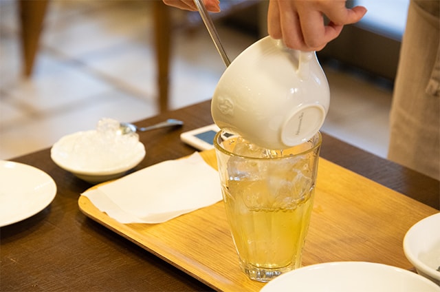 後半は、新商品の「柚子グリーンティー」をご紹介。まだ暑さの残る時期でしたので、ティーバッグで簡単に美味しく淹れるアイスティーをデモンストレーションし、試飲していただきました。ティーカップとソーサーを使って、オンザロックスで淹れる方法です。ゴールドカラーに輝くお茶の色に、皆さん注目!ドライの柚子チップがほんのり香る、すっきりとした味わいは好評でした。