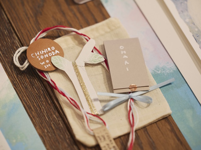 さらに、SONODA CHIHIROさんお手製のミニポーチやボンドをつけるための小さなヘラ、「OHARI」と書かれた針ケースなど、どれもSONODA CHIHIROさんのセンスが光るアイテムでテーブルの上が埋め尽くされました。