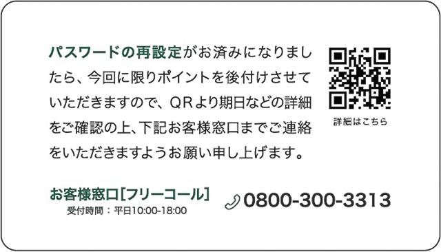 STEP3お電話がつながりましたら、「パスワード再設定によるポイント後付のご連絡」とお伝えください。
