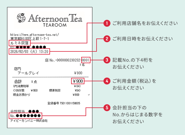 STEP5ご本人様確認が出来ましたら、下記①~⑤のレシート内容を順番にお伝えください。