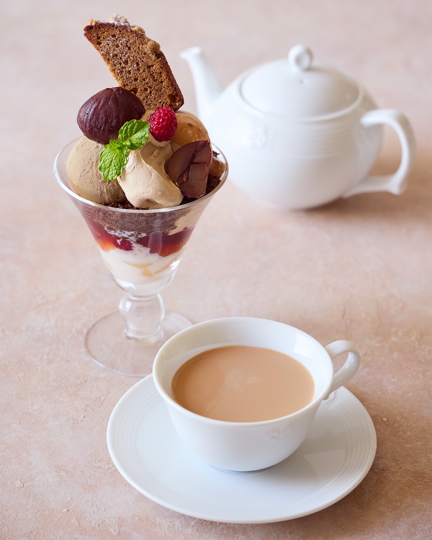 ミルクティーをイメージしたパフェをカスタマイズチャイとセットでどうぞ。