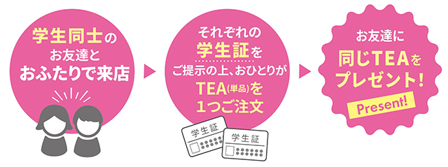 学生の方2人1組でご来店いただき、それぞれの学生証をご提示の上、TEA(単品)を1つご注文いただくと、もう1名様に同じTEAをプレゼント!