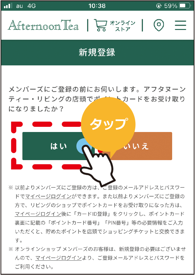 大変お手数をおかけ致しますが、店頭でポイント付与をご希望の方は、Afternoon Tea 公式アプリに会員情報の登録をしていただきますようお願い申し上げます。
